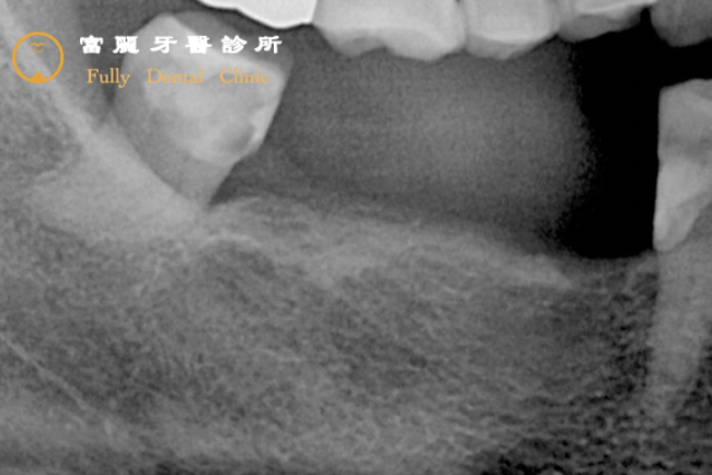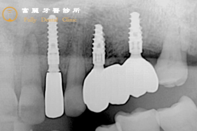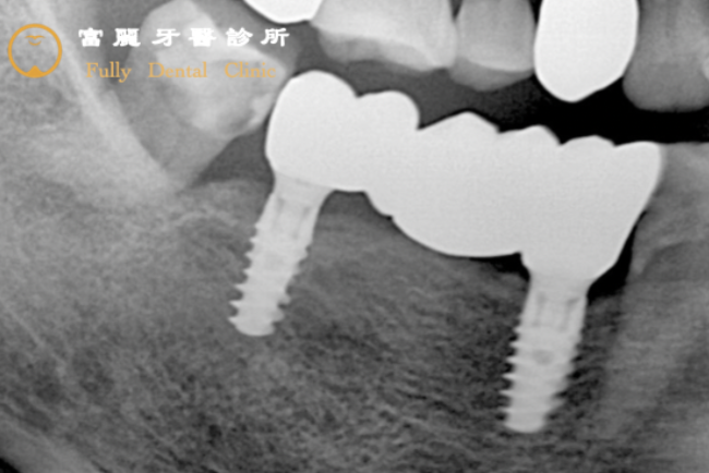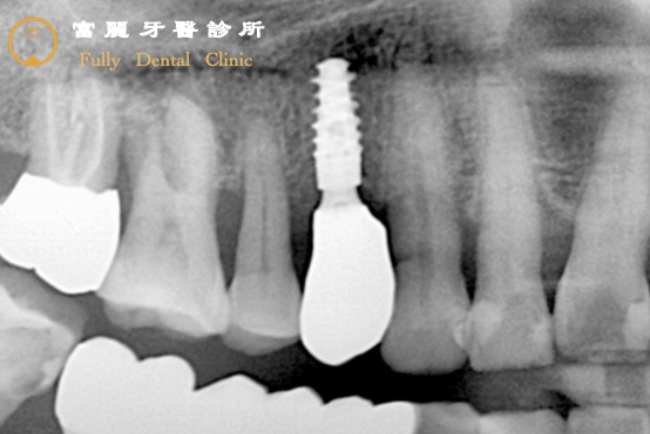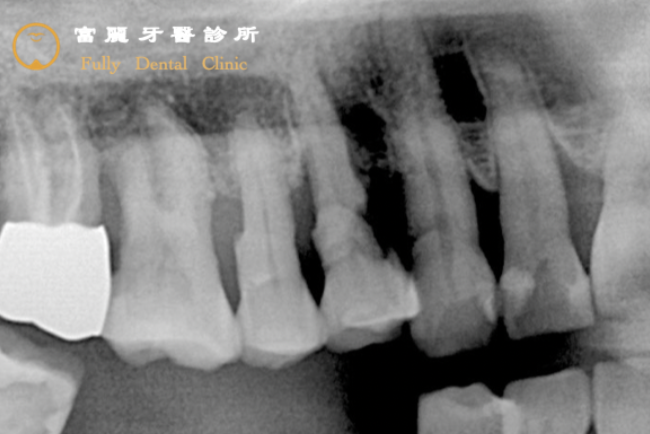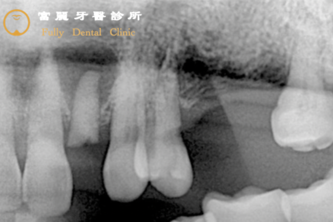 原本套上牙套的牙根因為長時間沉重的咬力而整個劈開,加上對咬合功能十分重要的大臼齒缺失,造成患者的咀嚼能力大大降低,因此決定以植牙來恢復!